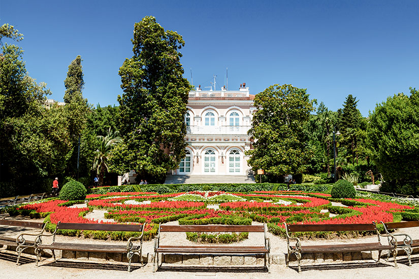 Der Stadtpark von Opatija besteht genau genommen aus zwei Teilen, dem Park Angiolina und dem Park des Heiligen Jakob. Er wurde zwischen den Jahren 1845 und 1860 fertiggestellt und hat schon mehrfach den Titel „Schönster Park Kroatiens“ erhalten. Für einen Spaziergang eignet sich der Stadtpark hervorragend, da ihr vor Ort auf gleich mehrere Sehenswürdigkeiten trefft. So befindet sich beispielsweise die Villa Angiolina, die von Iginio Scarpa um das Jahr 1840 erbaut wurde und vom Park Angiolina umgeben ist, im Stadtpark. Heute könnt ihr das Kroatische Tourismusmuseum, welches 2007 gegründet wurde, in der hübschen Villa besuchen. Früher diente das Gebäude als Herberge für die Aristokratie. Hier wächst auch die Kamelienblüte, das Symbol der Stadt Opatija. Ihre Hauptblütezeit könnt ihr bei einem Urlaub bis Ende März erleben.