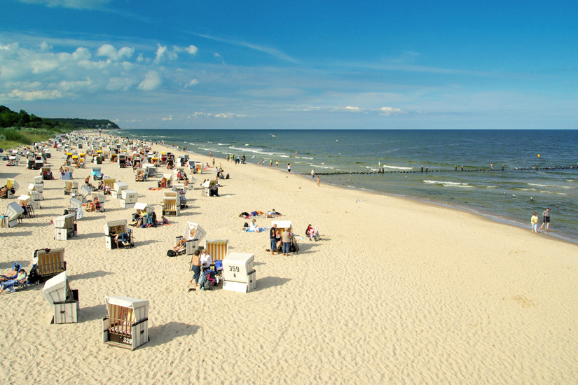 Die Insel Usedom liegt in der Pommerschen Bucht und gehört zu Deutschland sowie in einigen Gebieten zu Polen. Insgesamt bietet die Ostsee hier 45 Kilometer Strand. Vor allem für Familien ist der Strandabschnitt Heringsdorf perfekt. Der Ostseestrand hier ist feinsandig und damit für Kinderfüße sicherer. Große, scharfkantige Steine sind nicht zu befürchten und Sandburgen lassen sich entlang des etwa 70 Meter breiten Strandes in sicherer Entfernung zum Meer bauen. Auch Erwachsene lieben den weißen Stand, der Sonnenbad und Strandsport wie Beachvolleyball gleichermaßen ermöglicht. Es locken zudem eine Minigolfanlage und Spielplätze. Für Wasserratten jeden Alters ist der Gang zum Wasser bequem, da der Strand flachabfallend ist.