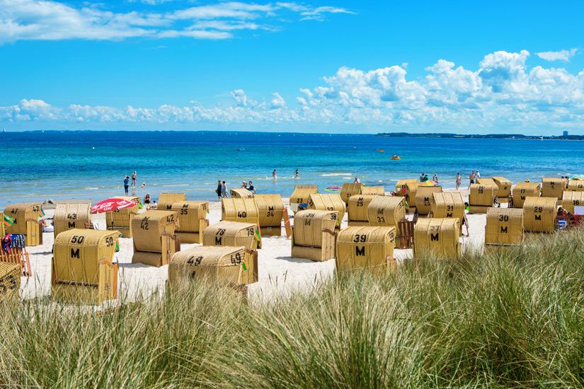 In der Kieler Bucht liegt einer der schönsten Strände der Ostsee. Der weiße Sand und die aufgestellten Strandkörbe lassen keinen Zweifel daran aufkommen, dass der Ostseeurlaub begonnen hat. Auf insgesamt acht Kilometern Länge finden Familien, Paare und Gruppen ausreichend Platz und können zur Abkühlung über den flachabfallenden Strand ins Meer gelangen.