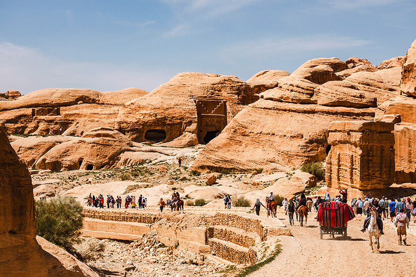 Neben der Erkundung zu Fuß oder mit der Kutsche kann auch eine Mischung gewählt werden: Im unteren Teil der Stadt Petra wird alles zu Fuß entdeckt, während der Hauptanstieg auf dem Rücken von Eseln bewältigt werden kann.