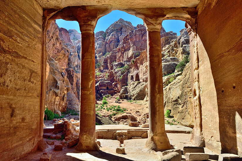 Die ersten Felsen, die die Felsenstadt von Jordanien kennzeichnen, türmen sich ebenfalls bereits am Anfang der Tour vor euch auf. Das Obeliskengrab und das Triclinium sind vermutlich Überbleibsel aus einer Zeit, in der die Toten geehrt und Feste in bestimmten Räumlichkeiten für sie gefeiert wurden. Passend dazu befinden sich gegenüber große Felsblöcke, die „Geistergräber“ genannt werden und deren eigentliche Funktion spannenderweise bis heute noch ungeklärt ist. Die Einheimischen bezeichnen sie schlicht als „Dschinn-Blöcke“.