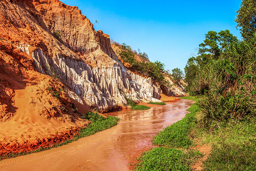 Im östlich gelegenen Stadtteil Mũi Né gibt es einen kleinen Bach namens Fairy Stream, der je nach Stelle maximal knietief ist. Das Besondere an ihm ist seine rötliche Färbung. Dieselbe Farbe weisen auch die Felsen auf, die ihn an einer Seite flankieren. Wandert durch das sandige Bachbett oder auf den Felsen Richtung “Landesinnere”. Teilweise ist auch das Schreiten an der flachen Seite des Bachs möglich, wenn die Vegetation nicht zu dicht ist. Nach einem etwa zwanzigminütigen Marsch – beginnend an der Küste – trifft man auf einen kleinen Wasserfall. An dieser Stelle bietet sich dann die Rückkehr an.
