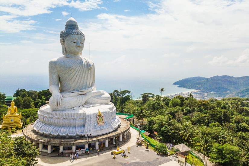 45 Meter hoch ragt er inmitten der Chalong Bucht in die Höhe: Der als Wahrzeichen von Phuket bekannte Big Buddha. Auch hier findet sich eine Tempelanlage, welchen die imposante Statue umgibt. Vom Big Buddha aus seht ihr die malerische Bucht zu euren Füßen und das Meer aus einer ungewohnten Perspektive.