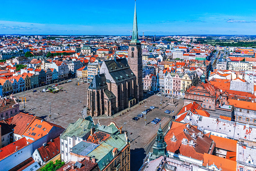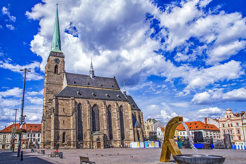 Die gotische St.-Bartholomäus-Kathedrale ragt als auffälliger Kirchenbau mit einem über 100 Meter hohen Turm in die Höhe. Dieser gilt unter anderem auch als Wahrzeichen der Stadt Pilsen. Das Gotteshaus wurde ab dem 13. Jahrhundert erbaut und hält den Rekord als höchste Kirche Tschechiens. Der junge Hauptaltar aus dem Jahr 1900 gewann sogar einen Preis. Sehenswert im Innenraum ist auch eine Engelsfigur, die nach einer kurzen Berührung einen Wunsch erfüllen soll. Wer schwindelfrei ist, erklimmt zudem die knapp 300 Turmstufen und wird mit einer herrlichen Weitsicht über Pilsen und das umliegende Land belohnt.