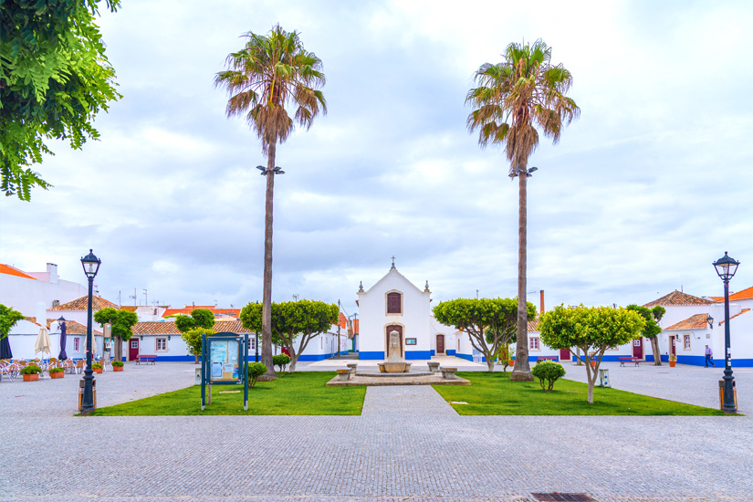 Wie so ziemlich jedes Haus im Ort mit seinen maximal einstöckigen Gebäuden, die über weiße Wände mit einem blauen Strich entlang des Bodens und terracottafarbene Dachziegel verfügen, ist auch Porto Covos Kirche mit diesen Merkmalen ausgestattet. Die höhere Eingangstür, das darüber befindliche vergitterte Fenster, das Kreuz sowie die beiden kleinen Spitzen am Giebel heben den Bau von der Umgebung ab. Im Inneren des vom Ende des 18. Jahrhunderts stammenden Gotteshauses erwarten euch ein holzverkleidetes Kirchenschiff und die für Portugal typischen Azulejos (weis-blaue Fliesen).
