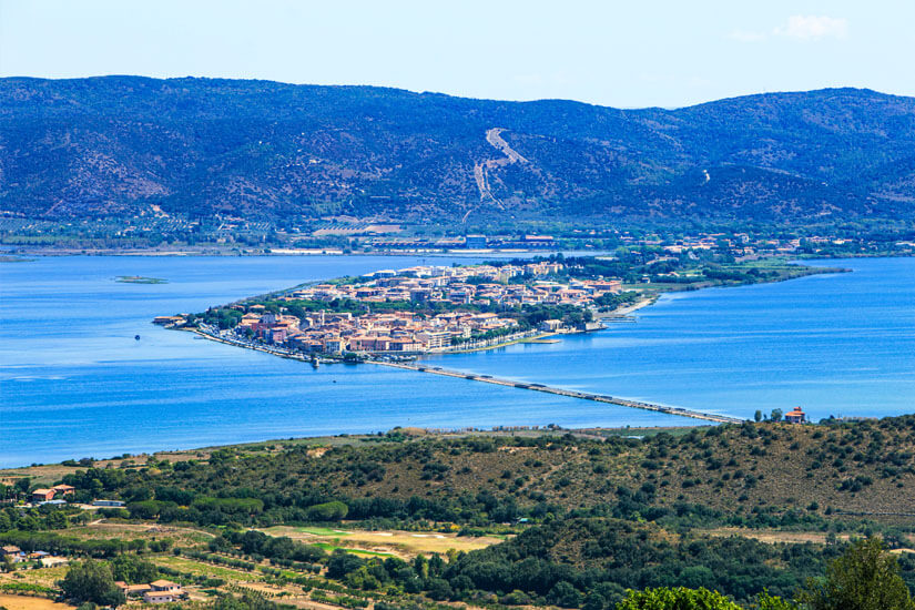 Die Lagune von Orbetello ist ein atemberaubendes Naturreservat östlich von Porto Santo Stefano und für ihre außergewöhnliche Flora und Fauna bekannt. Sie bietet eine Zuflucht für viele seltene Vogelarten, darunter rosafarbene Flamingos, die hier nisten oder Rast machen. Die Lagune umfasst 1.500 Hektar Marschland und ist durch zwei Landstreifen vom Meer getrennt, was sie zu einem einzigartigen Ökosystem macht. Besucher können die Schönheit des Gebiets beim Radfahren, Wandern oder bei einer Autofahrt durch die Lagune erkunden. Letzteres ist möglich, da eine Straße mitten durch sie führt. Die historische Windmühle, die aus dem Wasser ragt, verleiht dem Ort zusätzlichen Charme und ist ein beliebtes Fotomotiv. Ob ihr euch für Vogelbeobachtung, Naturfotografie oder einfach nur für Spaziergänge interessiert, die Lagune bietet ein unvergessliches Erlebnis. Namensgeber für den See ist die Stadt Orbetello, die ihr besuchen könnt, wenn ihr den kulturellen Aspekt des Urlaubs ausdehnen möchtet.