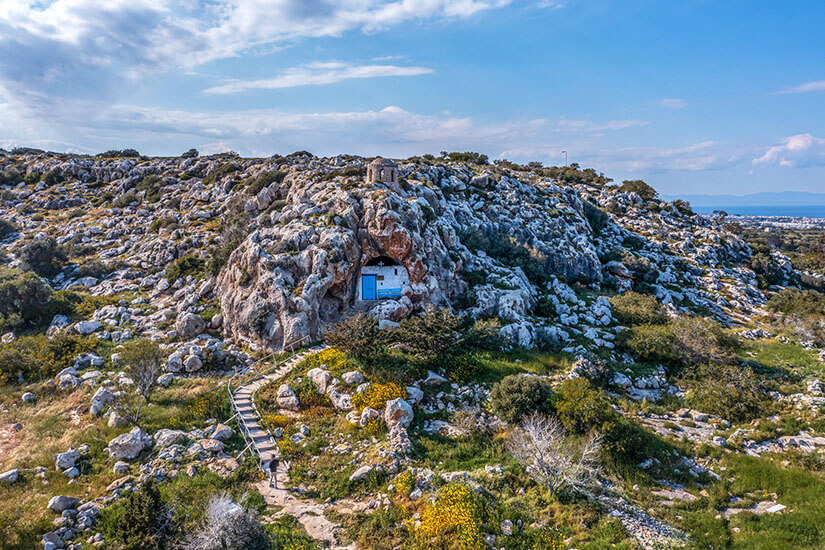 Dies ist wohl die einzigartigste und ungewöhnlichste Kirche Zyperns, die sogenannte Höhlenkirche Agio Saranta. Sie liegt in der Nähe der Profítis Ilías Kirche versteckt in einer Felsformation. Das Innere der Kirche gleicht kaum dem eines typischen Gotteshauses, denn Ikonostase, Ikonen oder Kerzenschein sucht ihr hier vergeblich. Die Höhle ist bis auf die weiße Farbe am Boden und dem Altar gänzlich unberührt und beeindruckt mit ihrer Natürlichkeit.
