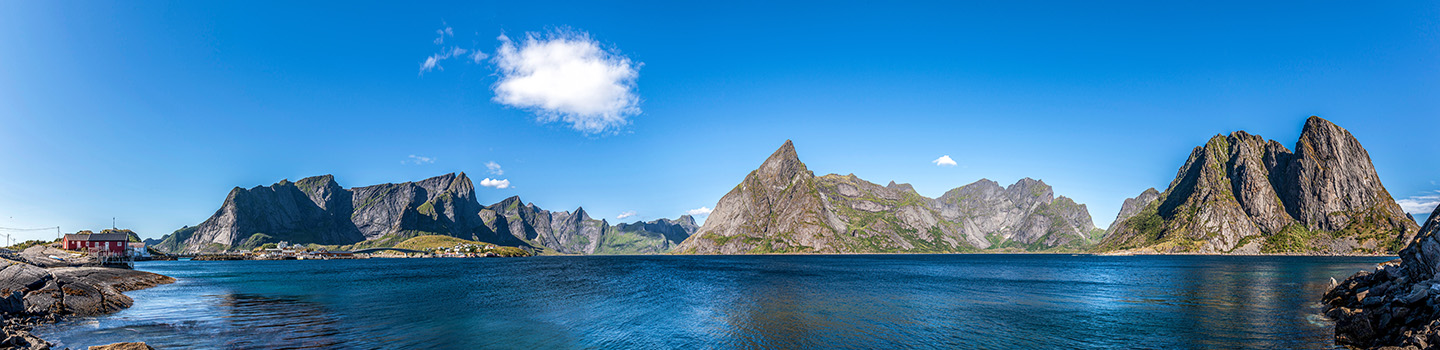 Mit gerade einmal 300 Einwohnern thront dieser Ort, der regelmäßig zu den schönsten der Welt gekürt wird, zwischen Berggipfeln und blauem Meer. Die charakteristischen roten Rorbuer, traditionelle Fischerhütten auf Stelzen, prägen das Bild. Hier genießt ihr nordischen Charme und grandiose Kulisse wie sonst nirgendwo.