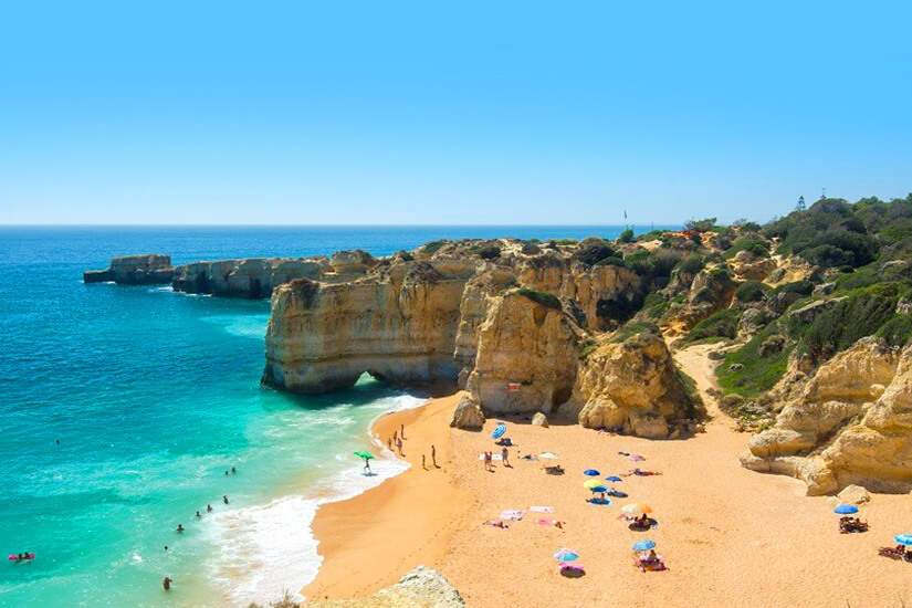 Das an der Algarve liegende Albufeira hat stolze 30 km Küstenlinie mit 25 Stränden zu bieten. Es besteht also mehr als genug an Auswahl. Befindet sich euer Hotel zentral in Albufeira, biete sich selbstverständlich Strände an, die fußläufig erreichbar sind. Zu ihnen zählen u. a. die Praia do Peneco, die Praia dos Pescadores, die Praia do Inatel und die Praia dos Alemães. Sie alle gehen ineinander über, so dass man problemlos wechseln kann, falls es mal ein einem Abschnitt zu voll sein sollte. Darüber hinaus hat jeder Strand seinen eigenen Reiz. So könnt ihr an der Praia dos Pescadores Volleyball spielen, Tretboot oder Wasserski fahren und Parasailing betreiben. Die Praia do Inatel ist von steilen Felsen eingerahmt und an der Praia dos Alemães wachsen vereinzelt Pinien auf den Klippen. Verfügt ihr über ein eigenes Auto oder über einen Mietwagen, gelangt ihr unkompliziert zu den weiter weggelegenen Stränden, bei denen es sich teilweise um nur kleine Buchten mit schönen Felsformationen handelt. Sie sind naturgemäß weniger überlaufen (für den Fall, dass ihr ein gewisses Ruhebedürfnis habt). Zu ihnen gehört die Praia da Coelha 7 km westlich vom Zentrum Albufeiras.