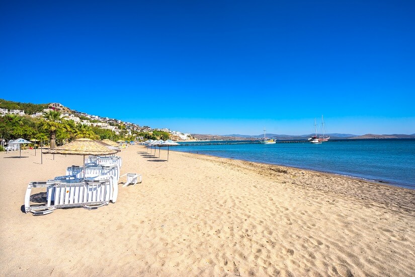 Im Oktober profitiert ihr im Urlaub an der Türkischen Ägäis von der Nebensaison, d. h. die Hotelpreise sind günstiger und es ist nicht mehr ganz so voll. Bodrum zählt ganz klar zu den gerne von Badeurlaubern angesteuerten Zielen an der türkischen Südwestküste. Gerade die Strände außerhalb der Stadt erfreuen sich großer Beliebtheit. Da wäre z. B. der zwölf Kilometer westlich von Bodrum gelegene Camel Beach, wo ihr euch nicht nur die Sonne auf den Bauch scheinen lassen könnt, sondern auch die Möglichkeit habt auf den Rücken von Wüstenschiffen zu reiten. Den kleinen Kamelbändigern wird außerdem der flache Einstieg ins Wasser gefallen. Gleich östlich an den Camel Beach schließt der Yahşi Beach an. Auch er findet großen Zuspruch bei Familien. Am gepflegten Strand könnt ihr euch bei Bedarf in eines der angrenzenden Restaurants setzen und türkische Kost probieren. An diesem Strand findet ihr sowohl aus Club- als auch Luxusurlauber Unterkünfte. Präferiert ihr kurze Wege, müsst ihr vom Stadtzentrum Bodrums bis zum Bitez Beach nur 6 km zurücklegen. Er punktet mit kostenlosen Sonnenliegen und -schirmen.