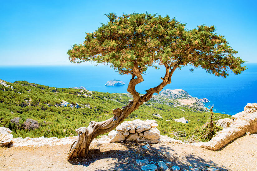 Rhodos, die „Insel der Ritter”, besticht durch ihre kontrastreiche Landschaft. Im Inneren erheben sich sanfte Hügel mit duftenden Pinien- und Zypressenwäldern, die besonders im Frühling von bunten Wildblumen durchsetzt sind. Das berühmte Tal der Schmetterlinge (Petaloudes) verwandelt sich im Sommer in ein Naturschauspiel, wenn tausende Schwammspinner die feuchten Schluchten bevölkern. Die Ostküste wird von Olivenhainen gesäumt, während im Süden eine fast mediterrane Steppe mit aromatischen Kräutern und niedrigem Buschwerk dominiert. Besonders eindrucksvoll sind die Quellen von Kallithea mit ihrer üppigen Vegetation und den kristallklaren Wasserbecken.