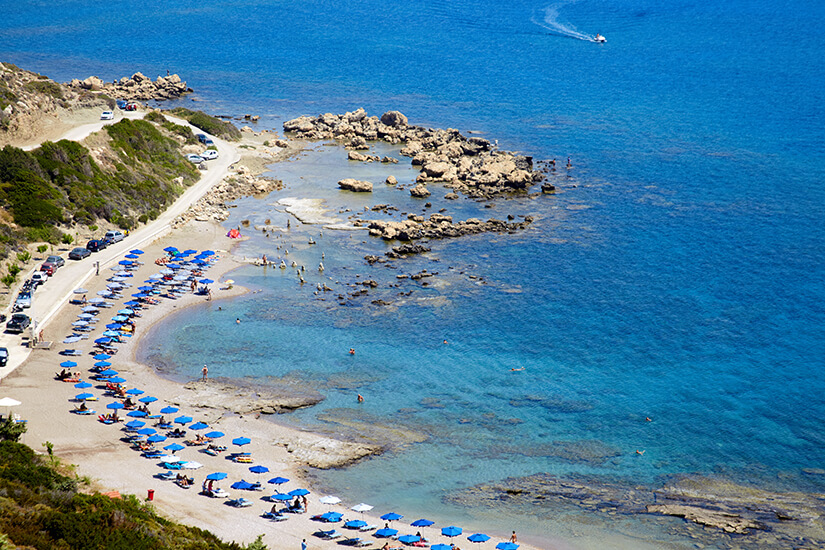 Die Küsten von Rhodos sind ein wahres Geschenk der Natur und bieten euch eine beeindruckende Vielfalt an Badeparadiesen für jeden Geschmack. Tsambika Beach gilt als einer der schönsten Strände Griechenlands mit seinem kilometerlangen, goldgelben Sand und türkisfarbenem Wasser. Hier könnt ihr sowohl organisierte Bereiche mit Sonnenliegen nutzen als auch naturbelassene Abschnitte für ein authentisches Stranderlebnis genießen. Das ruhige, warme Wasser macht ihn perfekt für Familien.