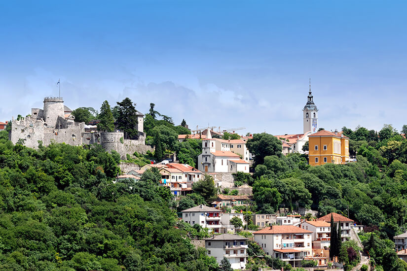 Trsat ist eine Burg, die seit dem 13. Jahrhundert hoch über der Stadt Rijeka thront. Das Kastell liegt 138 Meter über dem Meeresspiegel und zählt zu einer der ältesten und gut erhaltendsten Festungen an der kroatischen Küste. Um diese zu erreichen, müsst ihr jedoch erst einmal 538 Stufen erklimmen. Seid ihr nicht so gut zu Fuß unterwegs, bringt euch jedoch auch eine Seilbahn sicher an euer Ziel. Einst als Verteidigungsanlage genutzt, könnt ihr heute die gesamte Burganlage aus der Zeit der Spätgotik mit ihrem wunderschönen Burggarten besichtigen. Eine Galerie lockt Kunstliebhaber an und die Kirche der Heiligen Mutter Maria sowie das Franziskaner Kloster begeistern nicht nur gläubige Wallfahrer, die jedes Jahr zu diesem Ort pilgern, sondern auch interessiere Besucher. Der Schrein der Muttergottes von Trsat gilt als größter Wallfahrtsort im gesamten Westen Kroatiens. Ein weiteres Highlight von Trsat ist die spektakuläre Aussichtsplattform, welche euch einen wahnsinnigen Ausblick über die Altstadt und die Bucht von Rijeka eröffnet. Im Sommer wird die Festung als Eventlocation für Konzerte, Theateraufführungen und Festivals genutzt.