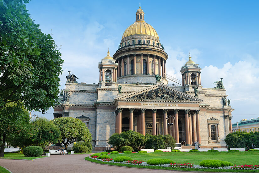 Auch die Isaak Kathedrale besticht mit prächtiger Architektur und reichen Verzierungen. Als größte Kathedrale der Stadt trumpft sie nicht nur mit einer riesigen Innenfläche, sondern auch mit 112 Säulen aus Granit sowie einer Goldkuppel, die einen Durchmesser von 26 Metern verzeichnet. Für ihren Bau wurden zehn Tonnen Blattgold verwendet. Die Isaak Kathedrale wurde Peter I. und Katharina II. gewidmet, wie ihr bereits an der lateinischen Innschrift am Haupteingang der Kirche erfahren könnt.