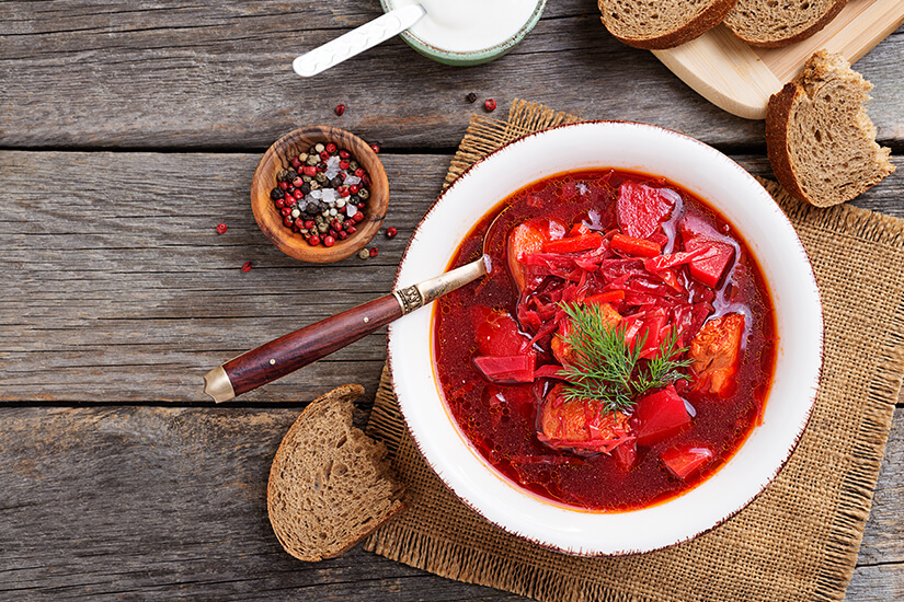 Geht ihr landestypisch essen, landen als erstes die Sakusi auf eurem Tisch. Dabei handelt es sich um viele kalte Vorspeisen, die aus Salaten, Suppen, Fisch, Brot und natürlich Wodka bestehen. Zum Hauptgang gibt es Borschtsch, Soljanka oder Schtschi – also einen deftigen Eintopf oder eine russische Suppe, welche mit Smetana Sahne garniert wird. Doch auch die gefüllten Teigtaschen Pelmeni oder deftige Bliny Pfannkuchen schmecken köstlich als Hauptspeise.