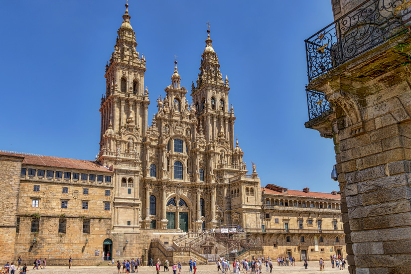 Offiziell gilt die majestätische Kathedrale als bedeutendes Bauwerk der Romanik, zahlreiche Erweiterungen spiegeln aber auch Architekturstile von Gotik über Barock bis zum Klassizismus wider. Am 1188 erschaffenen Haupteingang (Pórtico da Gloria) heißt die Figur des Apostels Jakobus am Mittelpfeiler die Pilger willkommen. Die Hand auf diese Säule zu legen, ist für viele Pilger der Höhepunkt ihrer Reise. Über dem Apostel sitzt Christus, der das Weltgericht abhält, umrahmt von den vier Evangelisten und je vier Engeln mitsamt ihrer Marterwerkzeuge. Unter dem Hochaltar der Kathedrale befindet sich der Legende nach das Grab des Apostels Jakobus, eine silberne Büste birgt seine Reliquien.