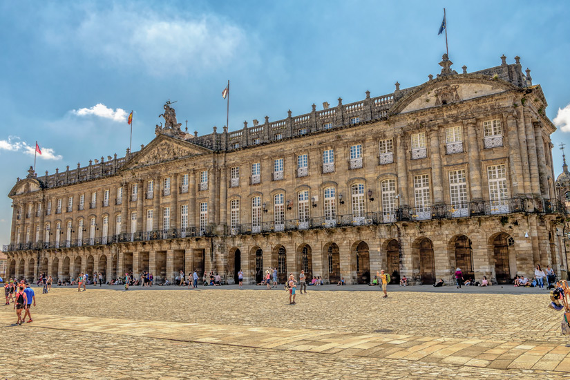 An der Praza di Obradoiro versammeln sich einige der bedeutendsten Bauwerke von Santiago. Wenn ihr die Kathedrale verlasst, lohnt es sich daher, kurz innezuhalten und den Blick einmal rund um den Platz schweifen zu lassen. Direkt vis á vis erblickt ihr die imposante, neoklassizistische Fassade des Raxoi-Palastes mit ihrem eleganten Arkadengang. Hier befindet sich der Regierungssitz von Galicien. Ein weiter Blickfang ist die prachtvolle Gotikfassade der Herberge für Pilger. Ursprünglich diente das reich verzierte Bauwerk mit seinen vier grünen Innenhöfen und der schönen Kapelle von Enriques de Egas den Katholischen Königen als Unterkunft. Heute befindet sich in dem historischen Gebäude das 5-Sterne-Hotel Parador Hostal dos Reis Catolicos.