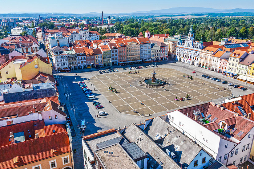 Bei Budweis (České Budějovice) müsst ihr an Bier denken? Wir ebenfalls! Neben dem Genuss des Exportschlagers lohnt sich die tschechische Stadt am Zusammenfluss von Moldau und Maltsch aber auch für ihre Sehenswürdigkeiten. Fangt mit eurer Tour im Zentrum an, wo auf dem Přemysl-Otakar II.-Platz der Samson-Brunnen steht. Wer sich einmal im Kreis gedreht hat, bekommt in wenigen Sekunden 48 Häuser im Barock- und Renaissancestil samt Bogengängen zu Gesicht. An die mit Maßen von 133 m x 137 m nahezu quadratische Fläche grenzt das Rathaus aus dem 16. Jahrhundert mit drei Türmen und vier auffälligen Statuen auf dem Dach.