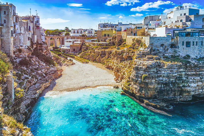 Der Ort Polignano a Mare ist bekannt für seine spektakuläre Lage an der Steilküste Apuliens. Die schönen Häuser drängen sich direkt an den Klippenrand. Außerdem bietet das gut besuchte Städtchen schöne Bademöglichkeiten. Rund um die Steilküste gibt es Grotten zu erkunden, die per Boot erreichbar sind. Und der Strand Lama Monachile ist nur wenige Minuten von der Altstadt entfernt. Die Bucht ist eines der berühmtesten Fotomotive von Polignano a Mare.