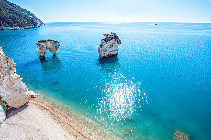 Apulien, im Absatz des italienischen Stiefels gelegen, ist eines der beliebtesten Ziele im Italien-Urlaub. Die vielen weißen Strände mit ihren versteckten Buchten fallen meist sanft ins Wasser ab. So auch die Bucht Baia delle Zagare, die besonders gut für einen Strandurlaub mit der Familie geeignet ist: Der weiße Sand führt flach ins Wasser. Imposante Felsen umgeben die Bucht und in der Nähe gibt es zahlreiche Höhlen zu entdecken, die oftmals von Fledermäusen bewohnt werden.
