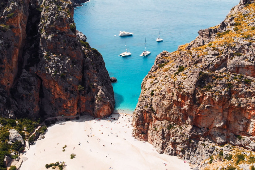 Einer der schönsten Strände von Mallorca liegt dort, wo man es eher weniger erwartet: Im Norden am Rande der Sierra de Tramuntana, dem langgestreckten Gebirge auf Mallorca. Die meisten Urlauber besuchen hier das Städtchen Sóller mit seinem Hafenort Port de Sóller. Etwas weiter nordöstlich liegt Sa Calobra. Der kleine Ort befindet sich an einer schmalen Bucht mit einem winzigen Strand samt gastronomischen Angebot und Parkplätzen. Eigentliche Attraktion ist jedoch die etwa 600 m enfernte, ins Mittelmeer mündende Schlucht Torrent de Pareis, wo zu regenreichen Zeiten ein Sturzbach fließt. Zur Schlucht und ihrem Kiesstrand gelangt man unter anderem durch einen in den Fels gesprengten Tunnel. Die Gegend ist ein landschaftliches Highlight und so lässt sich eine kleine Wanderung super mit dem Badeurlaub am zwischen Felsen gelegenen Strand verbinden.