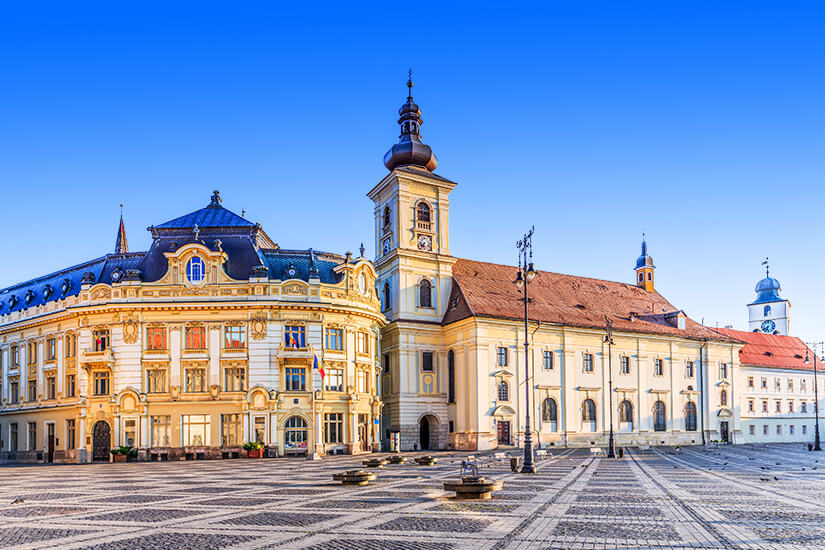 Das Herzstück von Sibiu diente einst als Marktplatz und Zentrum des öffentlichen Lebens. Es reihen sich historische Gebäude mit prächtigen Fassaden, darunter das barocke Rathaus, das Brukenthal-Museum und elegante Kaufmannshäuser aneinander. Auch die Touristeninformation mit vielen weiteren Tipps für euren Aufenthalt findet ihr hier.