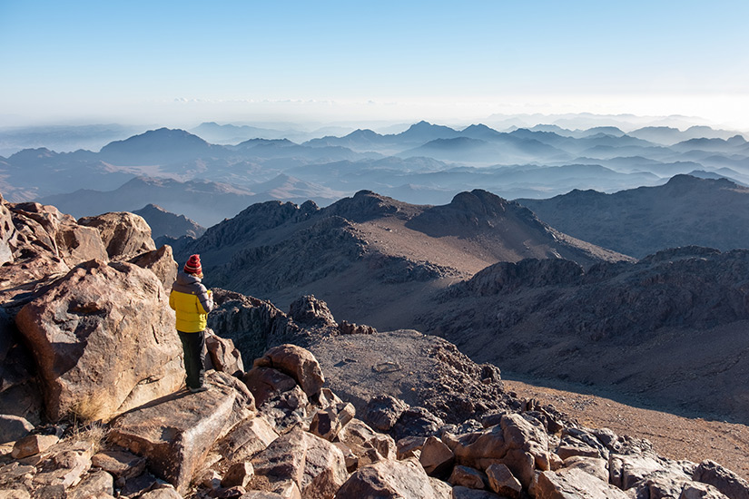 Wenn ihr den Berg Sinai erklimmt, trennen euch ab dem Katharinenkloster noch einige in den Felsen geschlagene Stufen vom Gipfel. Dort befinden sich eine Kapelle und eine Moschee. Nach dem Anstieg werdet mit einem atemberaubenden Blick über die ägyptische Berg- und Wüstenlandschaft belohnt.