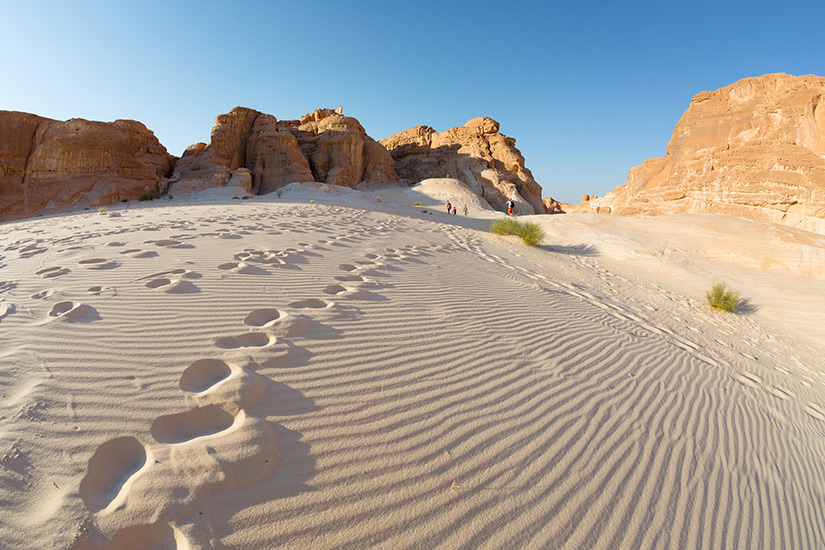 Auch die eine oder andere grüne Oase überrascht in der Wüstenidylle – ebenso wie die blauen Felsbrocken, die von einem belgischen Künstler in der ruhigen Farbe angestrichen wurden. Sie sollen an den Frieden zwischen den Ländern Ägypten und Israel erinnern.