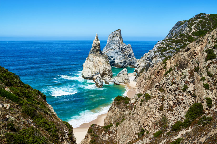 Unweit des Cabo da Rocas könnt ihr bequem das Badetuch ausbreiten. Die Praia da Ursa bezaubert mit ihrer ursprünglichen Atmosphäre aus weichem Sand, schroffen Felsen und dem Meer zu euren Füßen. Der Abstieg zum Strand erfordert zwar Trittsicherheit und festes Schuhwerk, doch danach kann der ungetrübte Badespaß beginnen. Insbesondere bei Ebbe lohnt sich ein Besuch, denn dann ist die Sandfläche breiter. Hier finden auch Surfer ein absolutes Paradies vor. Eine Alternative stellt die Praia da Adraga dar, die ebenfalls in der Nähe zu finden ist. Durch ihre geschützte Lage zwischen mehreren Felsvorsprüngen ist sie sehr beliebt. Trotz der vielen Menschen während der Hochsaison hat sie sich aufgrund der natürlichen Beschaffenheit aber ihren Charme bewahren können.