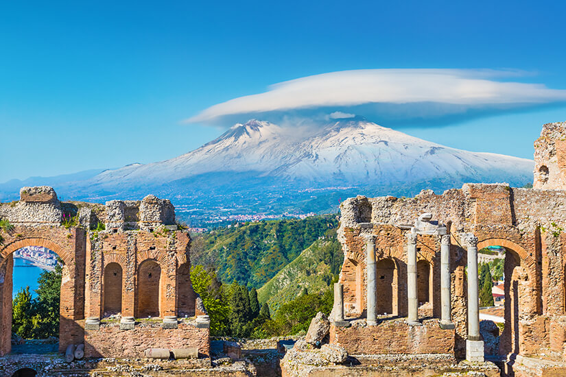 Besucht auf der Insel Sizilien außerdem das sehenswerte Taormina mit seiner mittelalterlichen Stadtstruktur und einem herrlichen Blick auf den berühmten Ätna. Die Stadt thront etwa 250 Meter hoch über dem Meeresspiegel. Doch keine Sorge vor dem Anstieg: Euch bringt eine Seilbahn bequem nach oben. Beeindruckende Sehenswürdigkeiten sind beispielsweise das griechische Theater, der Palazzo Corvaia und die Kirche San Pancrazio.