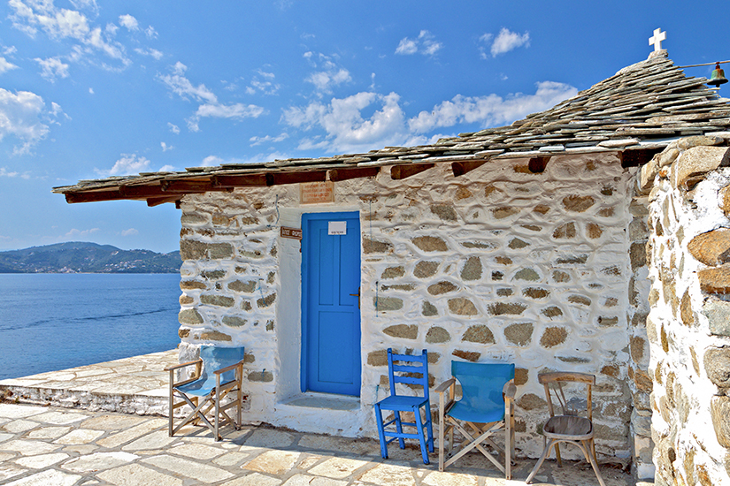 Im Inselinneren, etwa fünf Kilometer von Skiathos Stadt entfernt, trefft ihr auf ein weiteres, sehenswertes Bauwerk: das noch immer von Mönchen bewohnte Kloster Evangelistria aus dem 18. Jahrhundert. Umgeben von hohen Mauern, zeigen sich im Inneren beeindruckende Kunstwerke, wie eine von Ikonen verzierte Wand sowie ein kleines, informatives Museum. Durch die indirekte Beleuchtung der Kerzen herrscht schon gleich nach Betreten des Klosters eine nahezu meditative, erholsame Stimmung. Hier habt ihr einen tollen Ort zum Krafttanken gefunden!