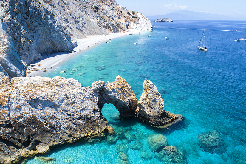 Paradiesische Strände sind der Hauptgrund für einen Urlaub in der griechischen Ägäis. Mit diesen kann auch Skiathos punkten. Die malerische Nachbarinsel von Skopelos mit ihrer grünen Landschaft macht außerdem als Drehort eines berühmten Hollywood-Streifens von sich reden.