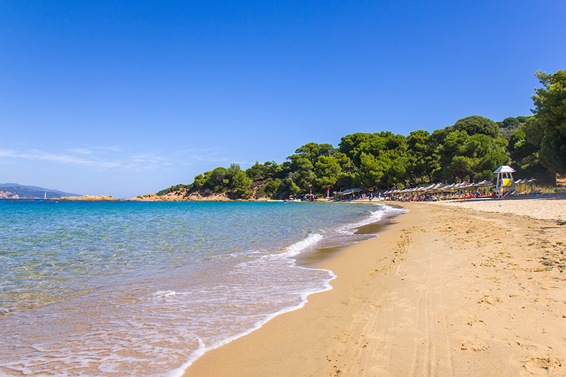 Der bei Familien beliebte Strand Koukounaries ist gleichzeitig einer der bekanntesten Strände von Skiathos. Freut euch auf einen von Bäumen gesäumten, goldenen Sandstrand mit flach abfallendem Verlauf und reichlich Gelegenheiten für eine kulinarische Stärkung. Die griechischen Tavernen laden vor oder nach dem Wassersport zu traditionellen Gerichten in stimmungsvoller Umgebung ein. Immerhin handelt es sich bei Koukounaries um einen der natürlichsten Strände, die ihr so im gesamten Mittelmeer vorfinden könnt.