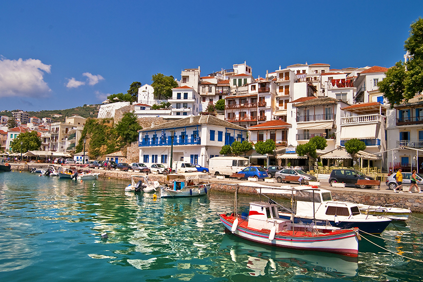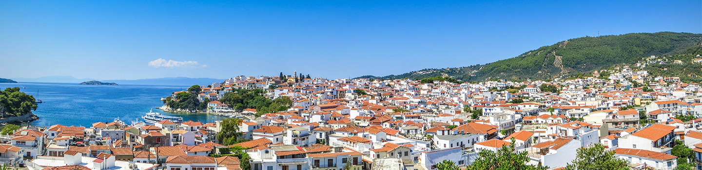 Alte Städte mit historischen Sehenswürdigkeiten sind Teil des Landschaftsbildes der nur rund 50 Quadratkilometer großen Insel. Zudem prägen dichte Wälder und Grünflächen die Kulisse des Eilandes, das sich in einen eher abgeschiedenen Nord- und einen stärker frequentierten, turbulenten Südteil unterscheidet. Die meisten der rund 6.000 Einwohner leben in Skiathos Stadt, das mit schmalen Gassen, weißen Hausfassaden und roten Dächern besticht.