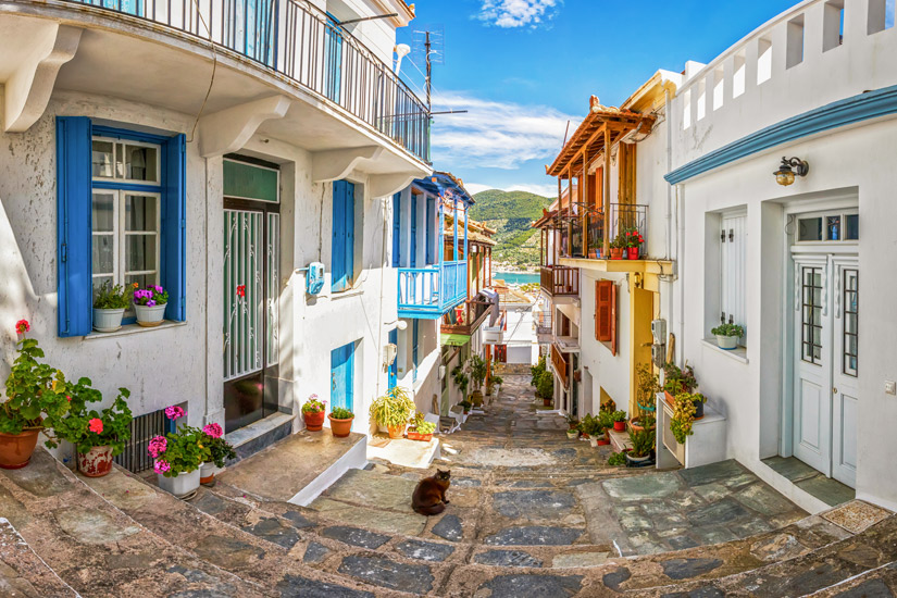Im Hauptort der Insel befindet sich die Promenade Skopelos Chora, welche euch durch die Gassen der historischen Altstadt führt. Hier könnt ihr die inseltypische Architektur aus verschiedenen Epochen erkennen und eine Vielzahl an Kirchen entdecken. Insgesamt soll Skopelos allein im Hauptort mehr als 300 dieser kleinen Kapellen zählen, sagt man. In Skopelos Chora könnt ihr Griechenland in seiner ursprünglichen Form erleben und mit Einheimischen ins Gespräch kommen. Ein Must-see ist zudem die Kirche Panаgitsa Рyrgοs, von der aus ihr direkt zum Hafen weiter schlendern könnt.