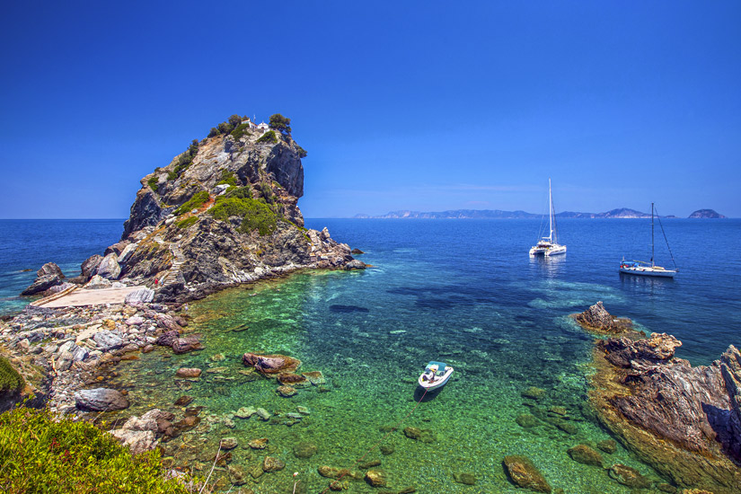 Skopelos gilt trotz seiner geringen Größe von nur 96 Quadratkilometern als eine der schönsten Inseln von Griechenland. Gelegen in den Nördlichen Sporaden der Region Thessalien, bietet Skopelos unzählige Traumbuchten zum Baden und Sonnen. Bei einer Schiffstour kommt ihr der türkisblauen Ägäis besonders nahe und trefft dabei vielleicht sogar Delfine, die vor Skopelos und den Nachbarinseln unterwegs sind. Zu großer Bekanntheit ist durch die dortigen Dreharbeiten zu „Mamma Mia“ auch die Kirche Agios Ioannis sto Kastri gelangt, die sich in der Nähe des Bergdorfs Glossa im Norden der Insel befindet. Wenn ihr Fans des Films seid und auf den Spuren von Meryl Streep, Pierce Brosnan oder Amanda Seyfried wandeln wollte, gelangt ihr über 105 Stufen zu diesem magischen Drehort und werdet oben angelangt mit einem Traumausblick auf die Ägäis belohnt. Weitere Drehorte befinden sich auf der Nachbarinsel Skiathos, die wir euch für euren Urlaub ebenfalls ans Herz legen können.