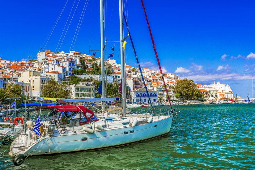 Weiterhin besticht Skopelos durch seine einzigartige Geschichte und Kultur. Der größte und gleichnamige Ort Skopelos präsentiert sich mit seinen weißen Bauten im typisch griechischen Stil und erinnert an bekanntere Reiseziele des Landes wie Santorin oder das schöne Mykonos. Geschmückt sind die Häuser durch bunte Blumen und duftende Zitruspflanzen und die roten Schieferdächer versprühen einen beinahe mittelalterlichen Charme. Aus dem Mittelalter stammt auch ein Großteil der Sehenswürdigkeiten auf Skopelos, darunter etwa 120 byzantinische Kirchen und eine venezianische Burg. Langweilig wird euch auf der Insel also trotz ihrer bescheidenen Größe nicht so schnell. Sie steht zudem für griechische Lebensfreude und kulinarische Köstlichkeiten, sodass die Reise nach Skopelos zum Traumurlaub für Genießer wird.