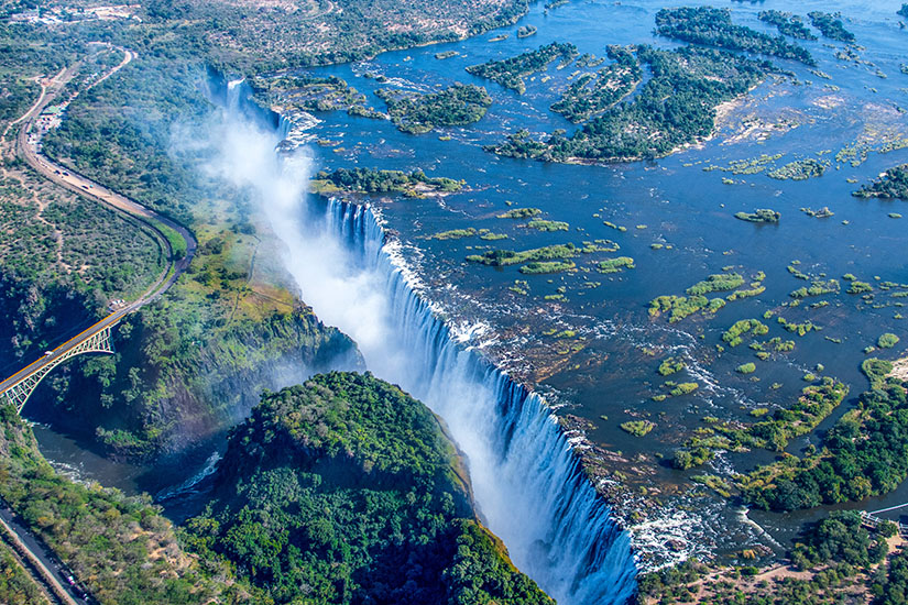 Die Viktoriafälle liegen zwischen Sambia und Simbabwe. Es handelt sich um den größten Wasserfall der Welt, der über einen Kilometer lang und mehr als 100 Meter hoch ist. Die Victoria Falls sind auch als „Mosi-o-Tunya“ bekannt, was so viel wie donnernder Rauch bedeutet. Denn das laute Rauschen des Wassers ist im Umkreis von bis zu 40 Kilometern zu hören. Auch aus der Luft ist es unmöglich, diese majestätische Naturerscheinung zu ignorieren.