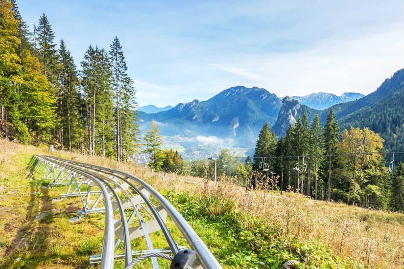 Die höchste Stelle befindet sich vier Meter über dem Boden – garantiert nichts für Fahrer mit Höhenangst! Die Sitzschalen mit Rückenlehne sorgen jedoch die ganze Fahrt über für Bequemlichkeit, selbst bei Geschwindigkeiten von 40 km/h. Vor oder nach der Rodeltour könnt ihr als Familie den Bergabenteuer Kinderspielplatz besuchen oder allgemein die Schönheit von Oberammergau in den Bayerischen Alpen genießen.