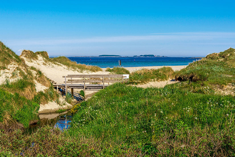 Zudem sind in Strandnähe Kriegsdenkmäler wie Bunker und Reste von Kanonenstellungen zu sehen. Daher lohnt sich hier auch ein Spaziergang wie etwa die fünf Kilometer lange Küstenwanderung nach Vigdel in Richtung Süden. Auf dem Weg gibt es viele Bademöglichkeiten zum Abkühlen.