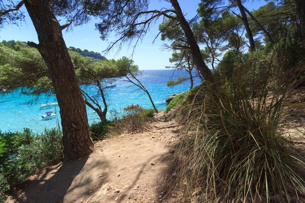 Wer einmal in dieser Ecke ist, sollte sich gleich noch den Strand Cala Macarella nebenan anschauen. Eingebettet in die schöne mediterrane Vegetation und die schroffen Kalkfelsen wirkt das Blau des Mittelmeers besonders magisch. Vom Parkplatz aus ist dieser Strand in 15 Minuten zu Fuß zu erreichen. Wer näher heranfahren möchte, muss kostenpflichtig parken, spart sich aber 10 Minuten Fußweg. Für den Klippenweg zwischen dem Cala Turqueta und dem Cala Macarelle empfehlen wir festes Schuhwerk.
