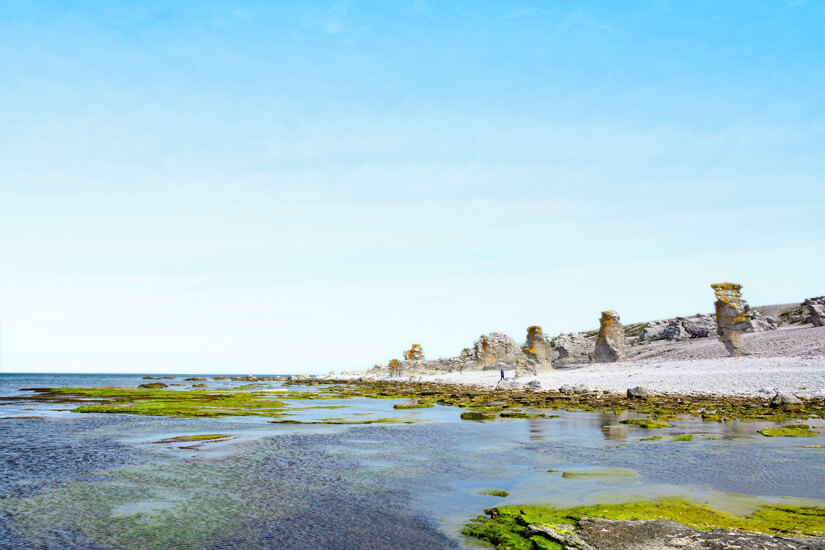 Nördlich an Gotland grenzt die kleine Insel Fårö, wo sich beim Örtchen Langhammers einer der ungewöhnlichsten Strände Schwedens befindet. Hier könnt ihr Rauken bestaunen – eigenartig geformte Kalksteinsäulen, die auch an anderen Stellen auf Gotland selbst zu finden sind und ihre Ursprünge im tropischen Klima des Silur-Zeitalters vor etwa 400 Millionen Jahren haben. Die Entstehung eines Kalksteinplateaus, aus denen Gotland zu weiten Teilen besteht, wurde Teil der einzigartigen Landschaft der Insel. In Langhammers gibt es eine hohe Konzentration der aus dem Boden ragenden Steine, was eine faszinierende Wirkung erzeugt. Lasst der Fantasie freien Lauf und ihr werdet schnell viele verschiedene Fabelwesen in den Formationen entdecken.