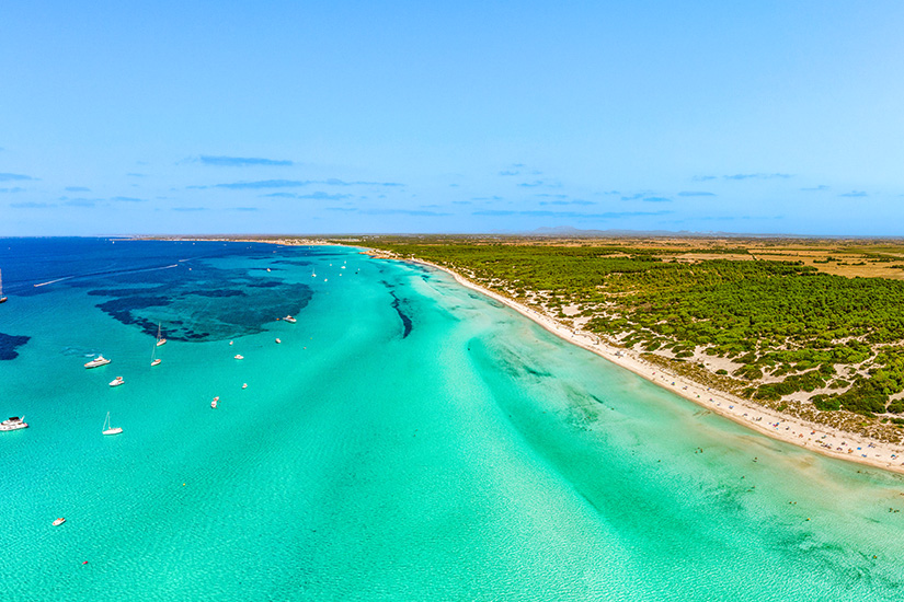 Die Platja des Trenc liegt im Südosten Mallorcas in einem Naturschutzgebiet und erstreckt sich über eine Länge von etwa 2,5 km entlang der Küste. Vor euch liegt das Meer, hinter euch Dünen mit Bewuchs sowie Salinen. Wenn ihr nicht gerade im klaren Wasser badet, könnt ihr euch im Sommer bei 27 °C in der Sonne aalen. In der Hochsaison kann es aufgrund der Beliebtheit des Strands etwas voll werden, in dem Fall legt ihr euch etwas entfernt von den Zugängen auf den Sand. In der Hochsaison sind vor der Platja des Trenc viele Segelboote unterwegs. Sonnenliegen und -schirme sind vorhanden, dafür keine Gastronomie. Es gibt Rettungsschwimmer sowie einen bewachten, kostenpflichtigen Parkplatz. Dank Blickrichtung Osten lassen sich am Strand Sonnenuntergänge verfolgen.