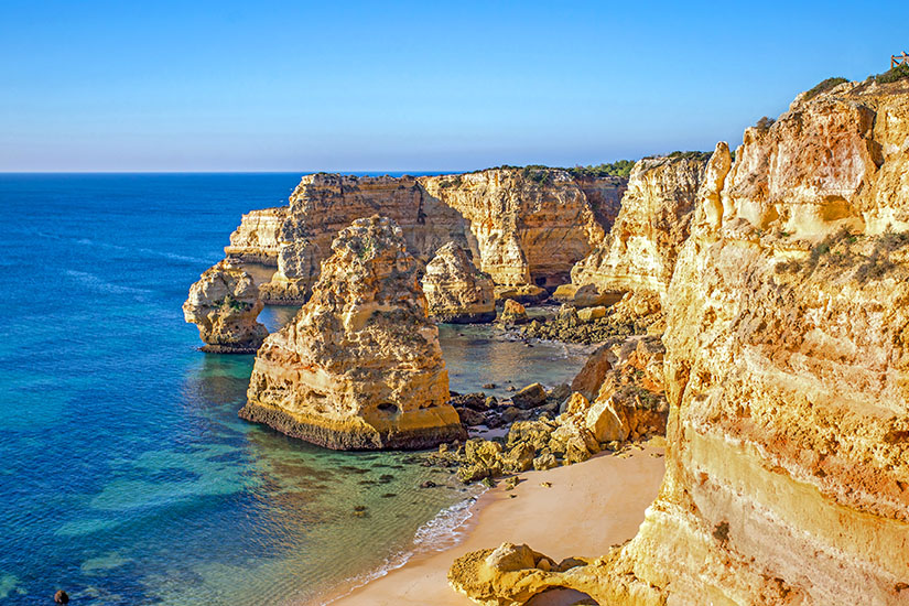Die Algarve im Süden von Portugal ist für ihre Küste mit beeindruckenden Felsformationen berühmt. Dazwischen lassen sich immer wieder Strände finden, darunter die Praia de Marinha, keine zehn Kilometer östlich von Carvoeiro. Vor dem 30 m tiefen Felsabhang befindet sich ein Parkplatz. Über viele Treppenstufen gelangt ihr schließlich zum Strand. Die Anstrengung lohnt sich, denn das im Sommer bis zum 23 °C warme Wasser ist glasklar und der Sand rinnt fein durch Finger und Zehen. Schnorchelt entlang der Klippen oder erkundet die durch Felsen getrennten Nachbarstrände mit einem Kanu. Am Kiosk könnt ihr euch während des Aufenthalts bei Bedarf eine Stärkung holen. Legt ihr von der Praia de Marinha einen etwa 1,7 km langen Fußmarsch zurück, könnt ihr durch ein Loch die Grotte von Benagil bestaunen. Alternativ steuert ihr sie per Ausflugsboot vom Wasser aus an.