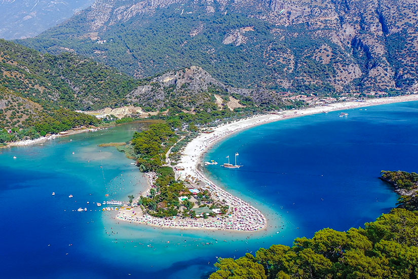 Ölüdeniz (auch “Die Blaue Lagune” genannt) ganz im Süden der Türkischen Ägäis, gilt als einer der schönsten Strände des Landes und wir wagen nichts anderes zu behaupten! Umgeben von Pinienwäldern und mit herrlichem Zugang zum türkisblauen Mittelmeer ist Ölüdeniz der Grund dafür, dass zur Badesaison zahlreiche Urlauber anreisen. Teile der Lagune stehen unter Naturschutz, damit diese Schönheit noch lange erhalten bleibt. Wer den Strand besuchen will, zahlt als Nicht-Hotelgast eine kleine Gebühr, damit dieser regelmäßig gesäubert wird. Freut euch im Sommer auf Wassertemperaturen von um die 25 °C. Möchtet ihr nicht im Ort Ölüdeniz wohnen, könnt ihr 13 km weiter nördlich in Fethiye unterkommen. Ölüdeniz ist zudem beliebt bei Paraglidern.