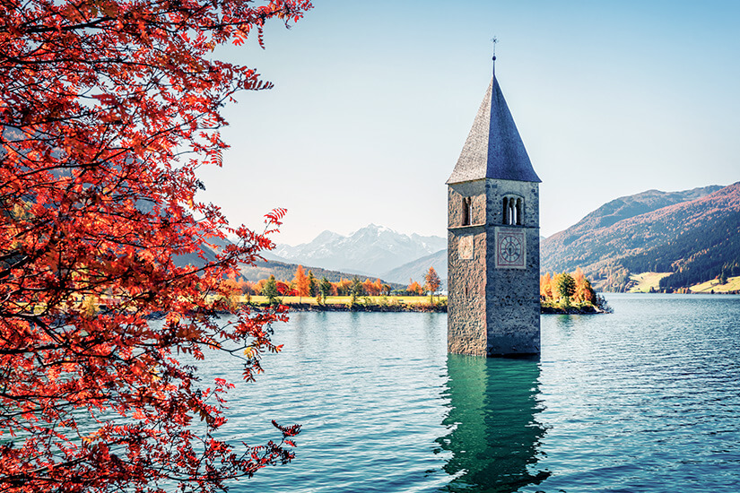 Der Reschensee ist andererseits aufgrund seiner Windverhältnisse eine hervorragende Kulisse für Kitesurfer und Segelsportler – rund um den aus dem Wasser ragenden Kirchturm, um den sich zahlreiche Sagen ranken, wird das Surfen zu einem Erlebnis der besonderen Art!