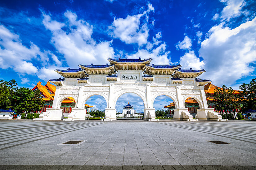 Direkt am quirligen Taiwan-Demokratie-Park gelegen, begeistert vor allem der riesige Torbogen mit seinem weiß-blauen Dach und dem hohen Holztor. Legt ihr einige Stufen zurück und betretet das Haupttor, so eröffnet sich euch ein riesiger Platz, auf dem sich eine Konzerthalle, die National Music Hall sowie ein Nationaltheater befinden. Oft finden hier auch Kampfkunst-Darbietungen, Musikauftritte oder Zaubershows statt. Eine riesige Bronze-Statue von Chiang Kai-shek ziert den Platz, welcher durch detailverliebte Fassaden begrenzt wird.
