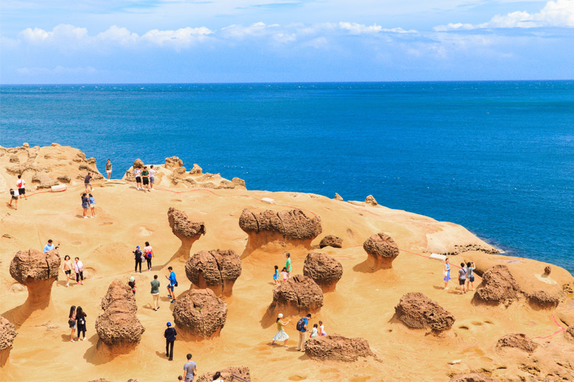 Im Norden des ostasiatischen Landes liegt der Geopark Yehliu, der durch seine vielseitigen und eindrucksvollen Steinformationen bekannt geworden ist. Der Park ist eine Halbinsel, der sich 1,7 Kilometer lang ins Meer streckt. Die verschiedenen Steingebilde, die ihr euch hier anschauen könnt, sind über lange Zeit hinweg durch Erosion entstanden und können euch angesichts der Kraft des Meeres ehrfürchtig werden lassen. Dort gibt es verschiedene Felsen, die ihrem Aussehen entsprechende Eigennamen bekommen haben (z. B. Drachenkopf, Geisha oder Seevogel). Außerdem lassen sich Felsen finden, die wie Pilze oder brennende Kerzen aussehen.
