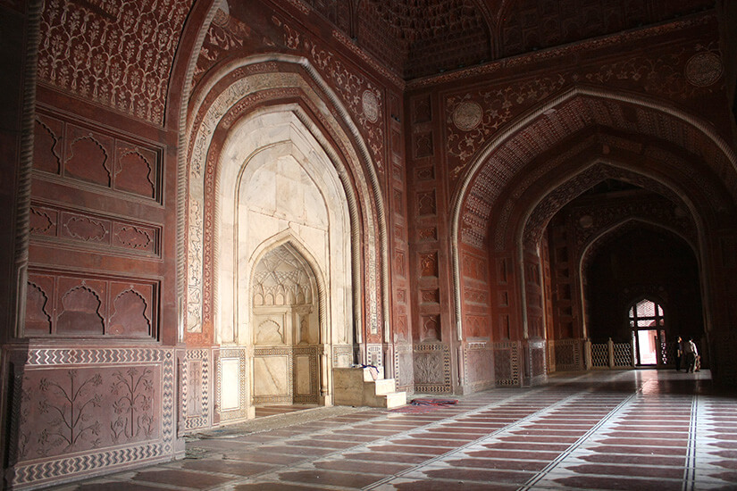 Äußerlich begeistert das Gebäude mit seinem (leider im Laufe der Zeit nicht mehr ganz so) weißen Marmor, den weitläufigen gepflegten Gärten und den vielen Details. Im Inneren dürft ihr euch auf mit Mosaiken geschmückte und mit Edelsteinen verzierte Wände und die Gräber des Großmoguls und seiner Prinzessin in der Krypta freuen. Diese sind ebenso prunkvoll gestaltet – wobei die Tatsache, dass letztlich der Sarg des Großmoguls der größere und auffälligere von beiden ist, angesichts des eigentlichen Bauanlasses des Taj Mahals zum Schmunzeln verleitet. Aber vielleicht war er ja auch einfach deutlich größer?