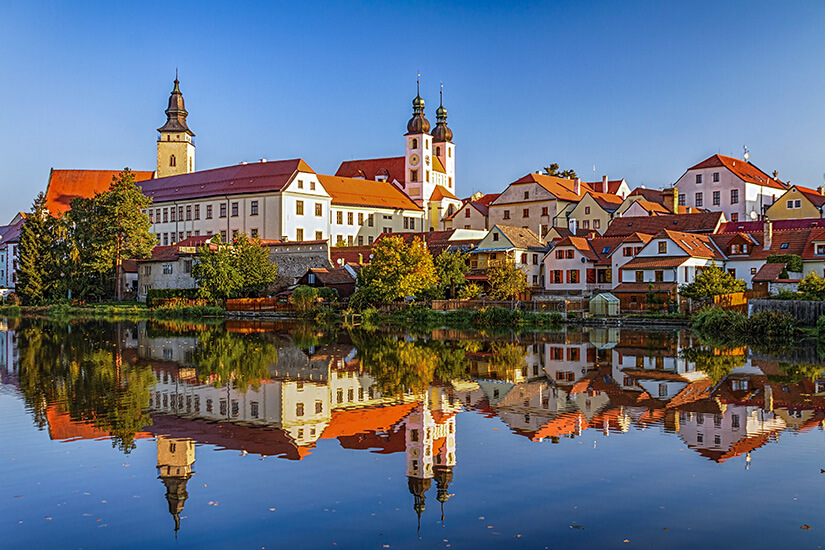 Zweifelloses Highlight der Stadtbesichtigung von Telč ist der Marktplatz, der von kristallklaren Teichen gerahmt wird und mit zahlreichen historischen Gebäuden gesegnet ist. Er ist zu recht einer der schönsten Marktplätze Europas und UNESCO-Welterbe. Zu den dortigen Bauwerken zählen alte Bürgerhäuser aus dem 16. Jahrhundert, die mit ihrer Fassade häufig die eigenen Dächer zu überragen scheinen und im Gotik-, Barock- oder Renaissancestil erstrahlen. Zum Teil messen sie bis zu zehn Meter in der Breite. Als größtes Gebäude ist das Rathaus zu nennen, das genau genommen aus zwei eigenen Bauten besteht und später gekonnt zu einer wunderschönen Einheit verbunden wurde.